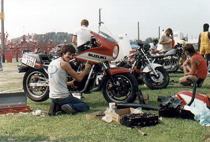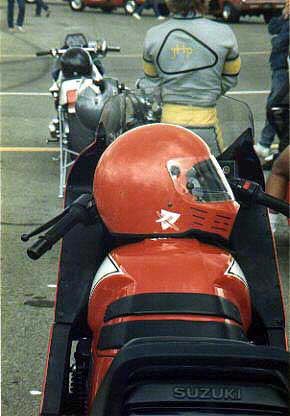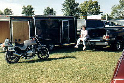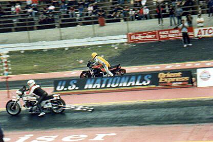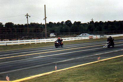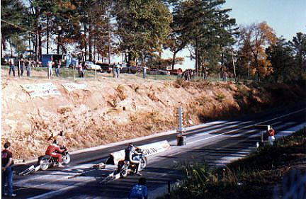 After watching the race action in Birmingham I realized that the idea of racing myself could be more than a dream. At the time I had the GS1100E and was riding it in the street. Soon after the AL race Scott and I took our street bikes to US131 DRAGWAY, in MARTIN MI. It was a lot of fun (even though I broke my clutch basket and barley made it back home). Scott ended up buying a 1984 GS1150ES, his sole reason to buy this bike was to DRAG race ! From the start Scott was running very quick ET & MPH (he only weighed 120LBS & the bike loved it). During one race up at CENTRAL MI DRAGSTRIP a veteran racer named Vic Force noticed how quick Scott was running. After some discussion Vic offered to take Scott's 1150 to his shop and perform some minor modifications (installed strut to lower rear end, brake and wheel bearing work to reduce drag etc.) Our only pay back was to set a national record and include Vic as one of our sponsors ! We decided to go for it and did set the AA/STOCK record for a stock motorcycle in both ET (10.69) & MPH (127) categories. The pictures below were taken during the time frame that we were going for the record !
