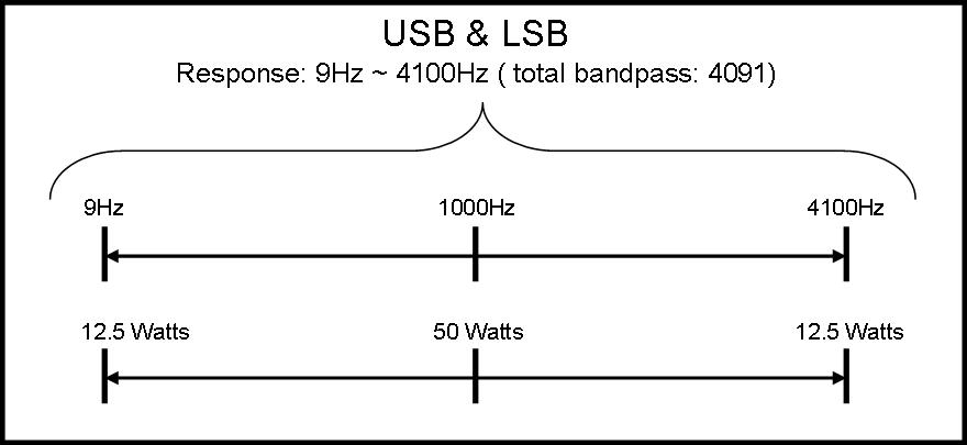 My TX and RX frequency response results = around 11Hz to 3600kHz (50W out at 1.800 Hz, 12.5W out at 11Hz and 3600Hz). I can push it to around 3800kHz with the EQ. See more detail regarding this by following the link above (or click here: carrier point adjustments)