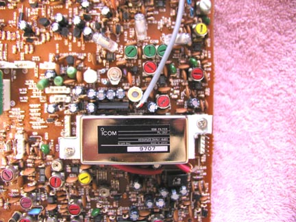 11/29/2002: The stock 930 filterset installation described above does provide very nice audio response but it is still a tadd narrow. To get a bit wider bandwidth (around 3.6 + if you push it) the INRAD # 475 (8830kHZ 4000Hz) and the ICOM FL-257 (455kHz 3.300Hz) filters are the ticket. These filters are not drop in, you will need to modify the IF board as shown below but it is an easy "adjustment". Please note that you will need to adjust the carrier set points for both LSB and USB, this is easy if you have a signal generator. Click this link to see the procedure I used to adjust the carrier set points