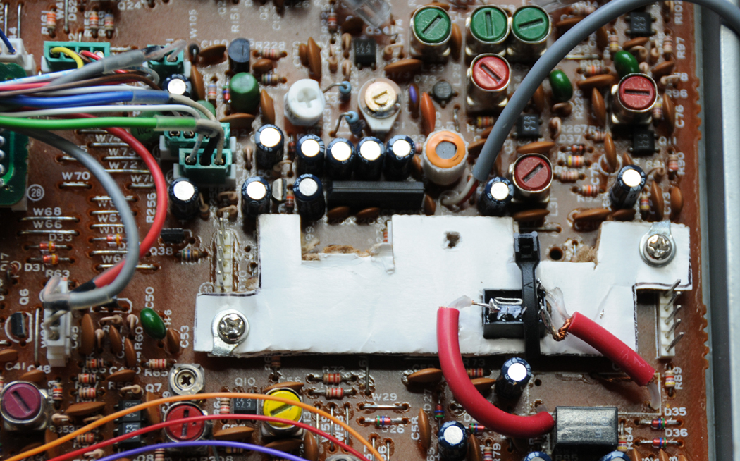 The ICOM FL-257 was mounted in the space on the IF board that the optional CW (455KHz) would go. To achieve this, I made a mounting plate out of cardboard. The connections are made via shielded jumper wires to the IF board. The grey wire above the filter is attached to C206. This is the point on the IF board where I apply the audio to the balanced modulator