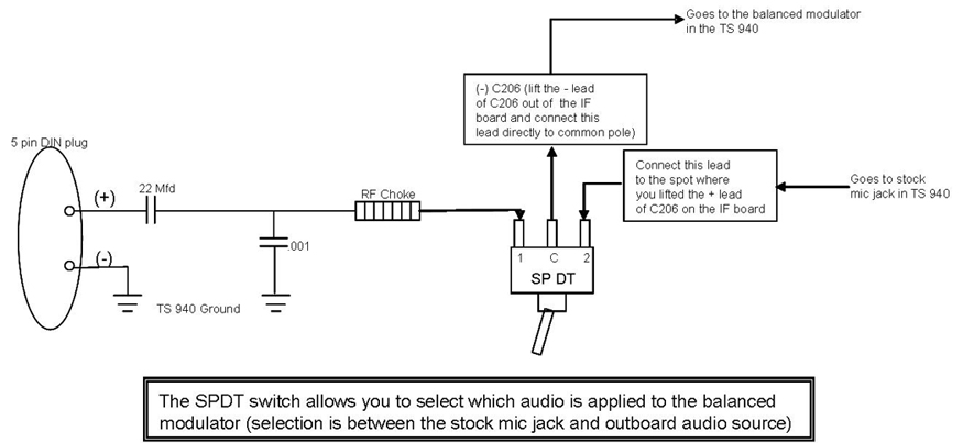 I made this modification to the audio circuit in the TS 940 (thanks to Terry, W6RU) and it has improved the TX audio response dramatically! Before the modification I ran the output from my DBX gear into the phone patch input on the back of the 940. In the past I also had run the audio gear directly into the mic jack in front of rig. Both of these configurations achieved the exact same result (not a lot of clean low end and lacking mid to high response). It was much better than just running the mic without the processing gear but it still was not what I wanted so ... With Terry's help I located the balanced modulator diode on the IF PC board and applied the audio from my outboard processing equipment directly ... well almost directly.