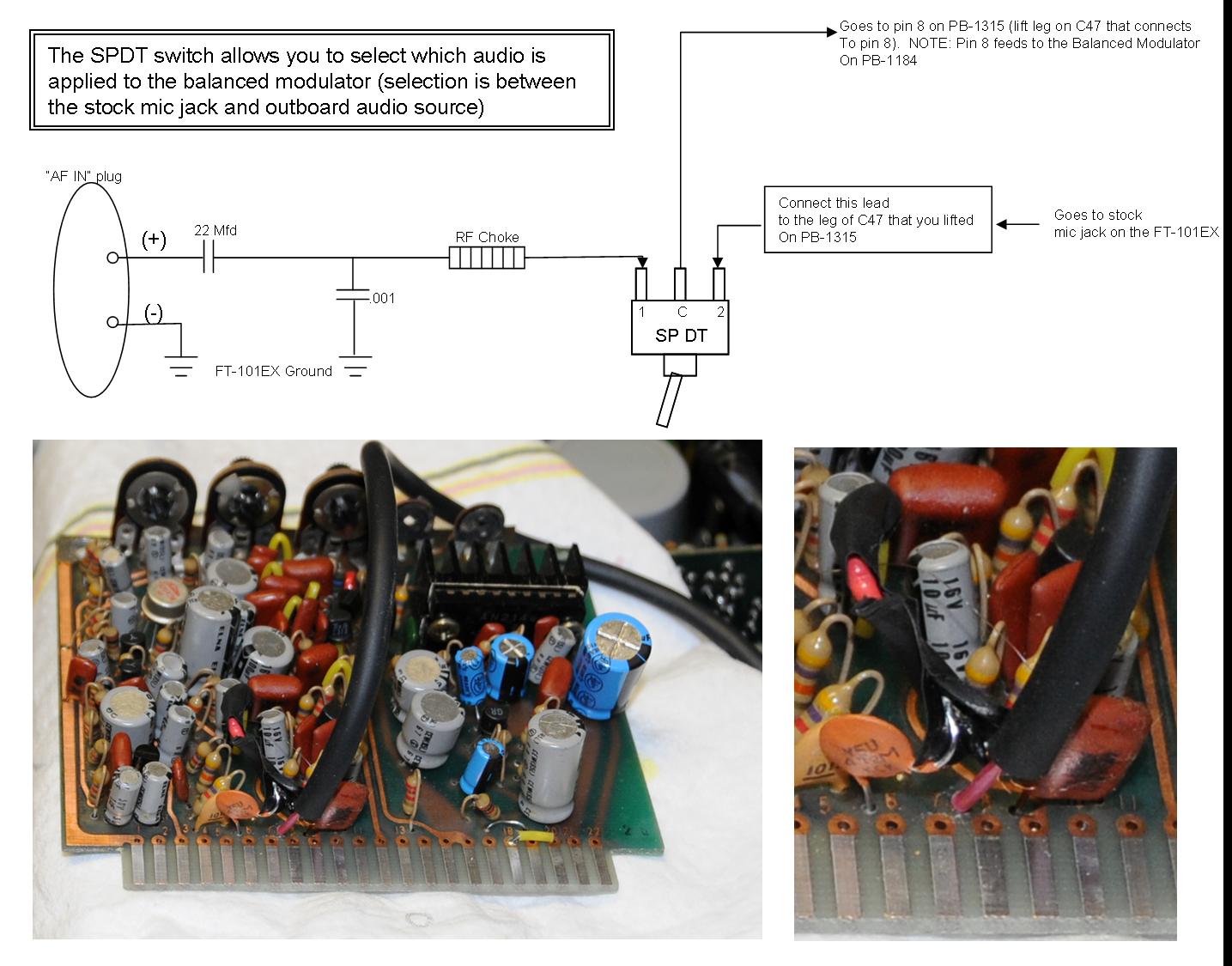 This modification bypasses the restrictive components in circuits between mic jack and the Balanced Modulator. I applied the audio from my rack to pin 8 of PB-1315 (AF Unit). In order to achieve this, I unsoldered the leg of C47 that connects to pin 8 and applied the audio from my rack to this point. (I installed a small SPDT switch that I use to select the audio source):