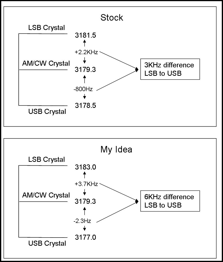 Under Construction.. I am still tweaking this mod. I purchased two crystals from International Crystal and installed them. My goal is to shift the carrier point so adjustments can be made to null out the carrier on each side band. Stay tuned for more information about this mod. Below is a visual of the stock crystal configuration and my work in progress idea.