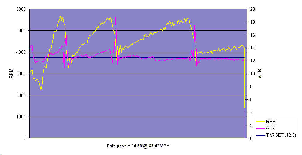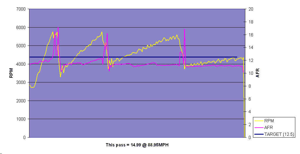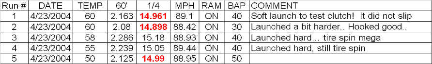 The data below represents three of the five 1/4 mile drag strip runs I made