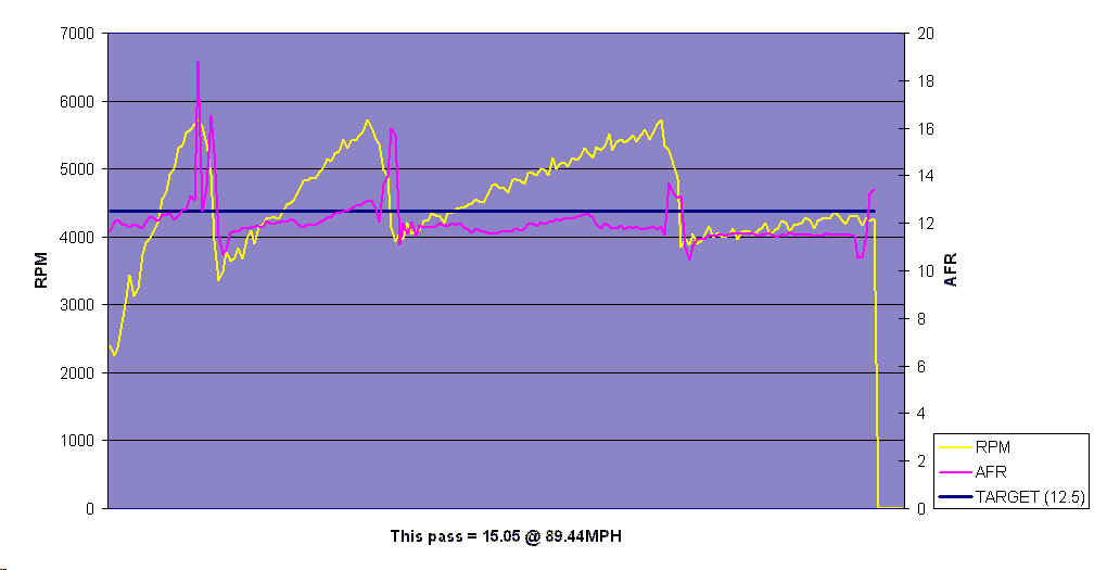In summary: I was very pleased with the performance I achieved at the track. The clutch did not slip and I got the 4Runner in the 14's. The charts above clearly show that I have no problem with fuel delivery. I believe that I can get the MPH higher, the 1/4 mile times lower by fine tuning the fuel map, timing map and BAP (Boost A Pump).