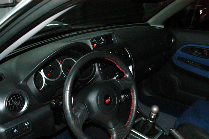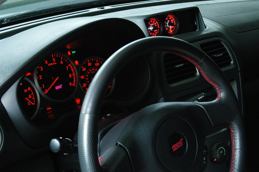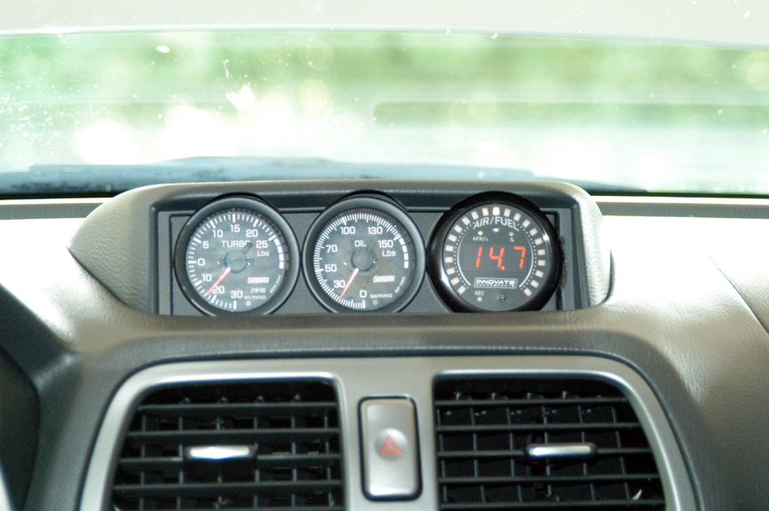 I like the appearance of the Subaru three gage center pod itself but not the gages so ... I went with a modified stock pod from: http://WRXtra.com with two 52mm Omori Full Color gages. The third "hole" in the pod has been filled with an Innovate Motorsports XD-1 Air Fuel Ratio gage (see photos at bottom).